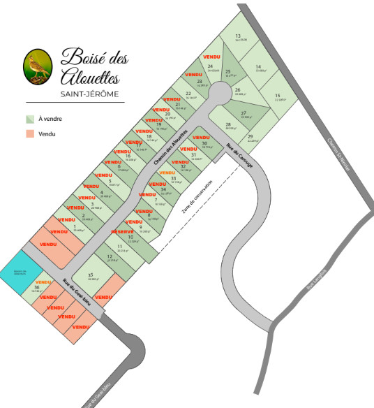 The residential project Boisé des Alouettes is located in the Bellefeuille sector of Saint-Jérôme. The lots are offered with a water supply only for single-family or intergenerational residences.